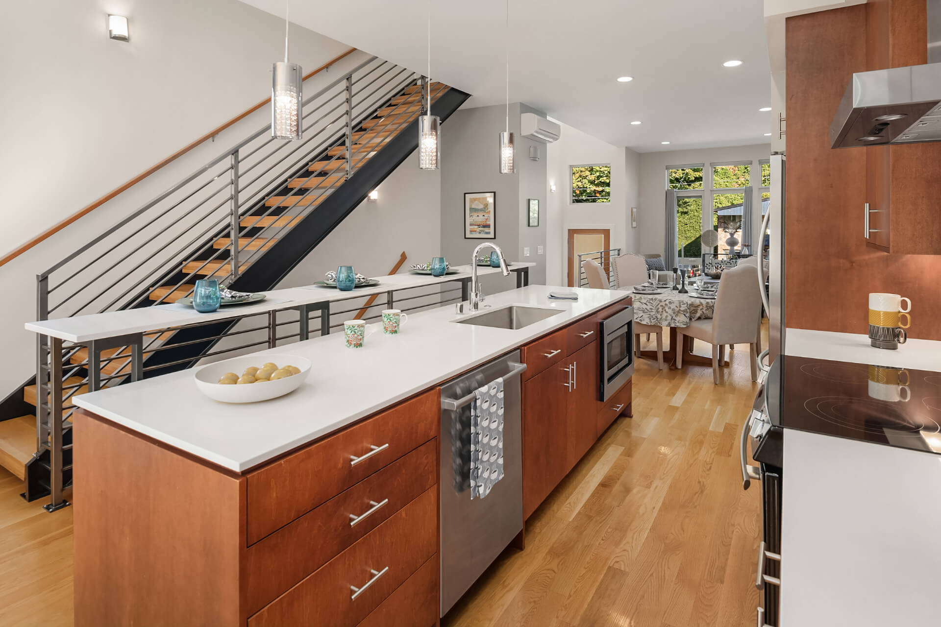The focus of photographing kitchens should be on the cabinetry, counters, and appliances. Adding accessories helps to add detail, and avoiding clutter is best.